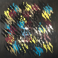 ‘A Life of Sound and Fury Signifying Nothing’ is the text upon a stained birch plywood board, with acid yellow, burgundy, electric blue and gold leaf accenting the piece from beneath. Heavy use of black shapes camouflage the text which can be slowly extrapolated. Coated in clear glossy resin.